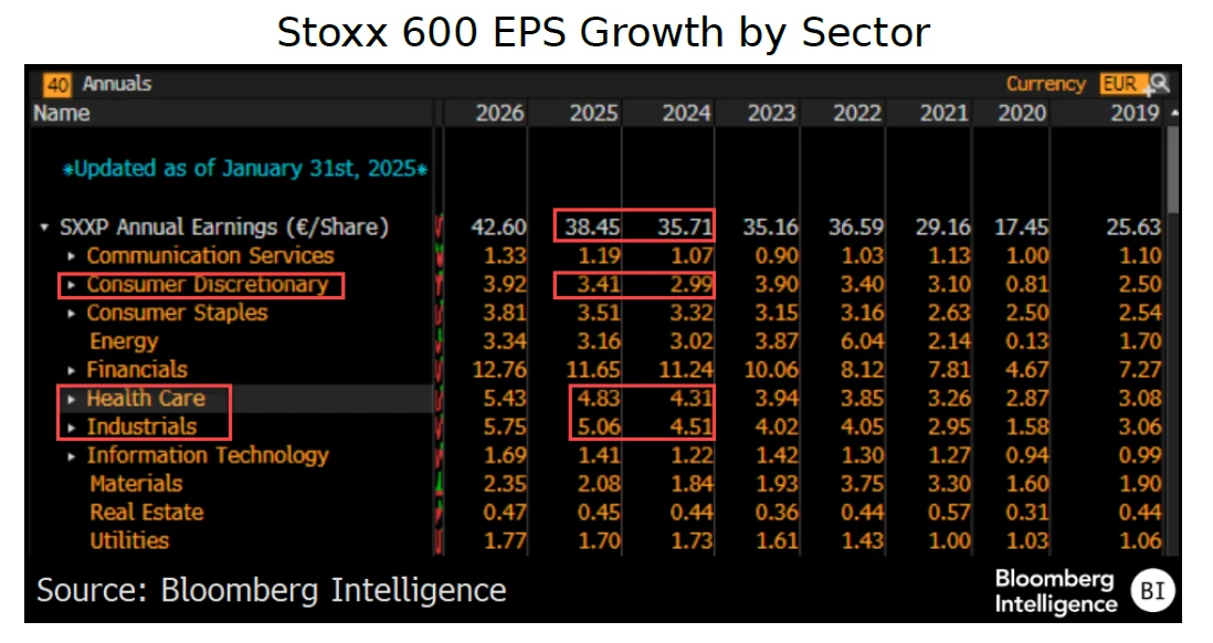 With European equities up 5% since President Donald Trump’s election, the market may be underestimating the risk posed by US tariffs, which could hit Stoxx 600 earnings by 3-7%. Healthcare, industrials and consumer discretionary, which account for 55% of the index earnings growth this year, are the most exposed.